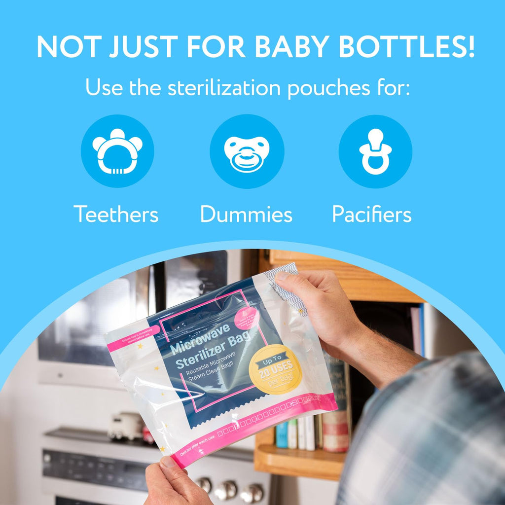 • Multipurpose Sterilization Bags: These large sterilizing bags for baby bottles are perfect not only for baby bottles but also for teethers, pacifiers, breast pump tubes, and training cups, making them essential diaper bag accessories for on-the-go parents