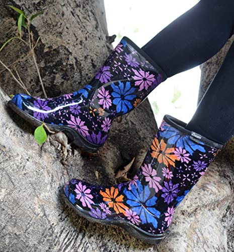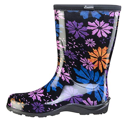 Details: Description Sloggers Women's rain & garden boots are just the right height for garden work or rainy days around town. Lower & wider than most rain boots, there's more room to tuck your pants into, & just like the rest of Sloggers made in the USA boots & shoes, they feature "All-Day-Comfort" insoles & a signature deep Lug sole for great traction in wet & muddy conditions. Sloggers boots are made from 100% recyclable, medical grade material, so they have a soft feel, produce no odor, are easy to hose off clean, & will last for years. The sole contains up to 50% recycled material & when you're finished with your boots, you can send them back to Sloggers & they'll turn them back into a new pair! how's that for "reuse & recycle"?