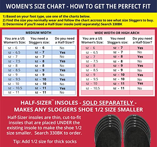 - Find Your Fit – Fit runs small; order a size up. For half sizes order a size up or try Sloggers Half Sizer Insoles. Place washable inserts under existing sole to create your perfect fit