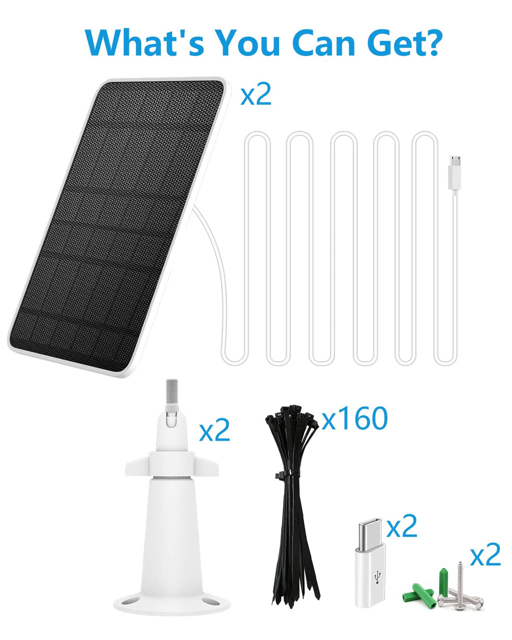• 【Package Included】-The solar panel kits are made of high-quality and environmentally friendly materials, including 2 solar panels with 3M cable with Micro USB port each, 2*USB-C port connectors, 2*360 degree mounting brackets, 6*screws, 160*cable tie. Please note that the charging efficiency depends on the intensity of the sun's rays and the speed at which the outdoor cameras consume power. If you have any questions, feel free to contact us, your satisfaction is always our aim.​