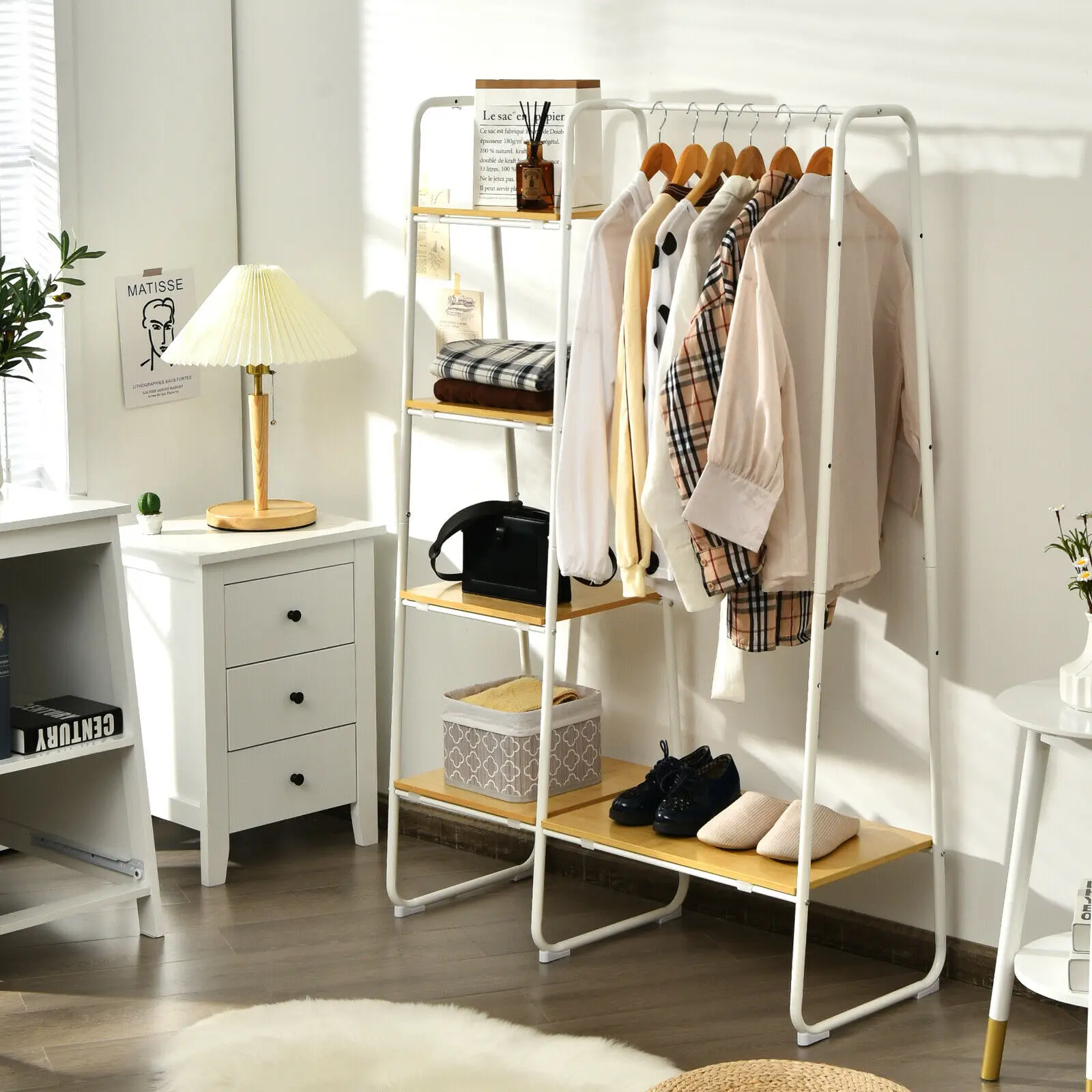 Are you finding a clothes rack for your home? Our functional clothes rack helps you to store various clothes and other miscellaneous household items. Made of powder-coated steel frame and thick particleboard, this garment rack is durable and can be used for long time. The compact design makes it suitable for limited space without occupying too much space. Besides, this 4-tier clothes rack with a built-in clothes rod provides large capacity to place clothes. Simple and chic style makes it ideal for any home, such as living room, bedroom and cloakroom. This meticulously crafted clothes rack is your ideal choice.