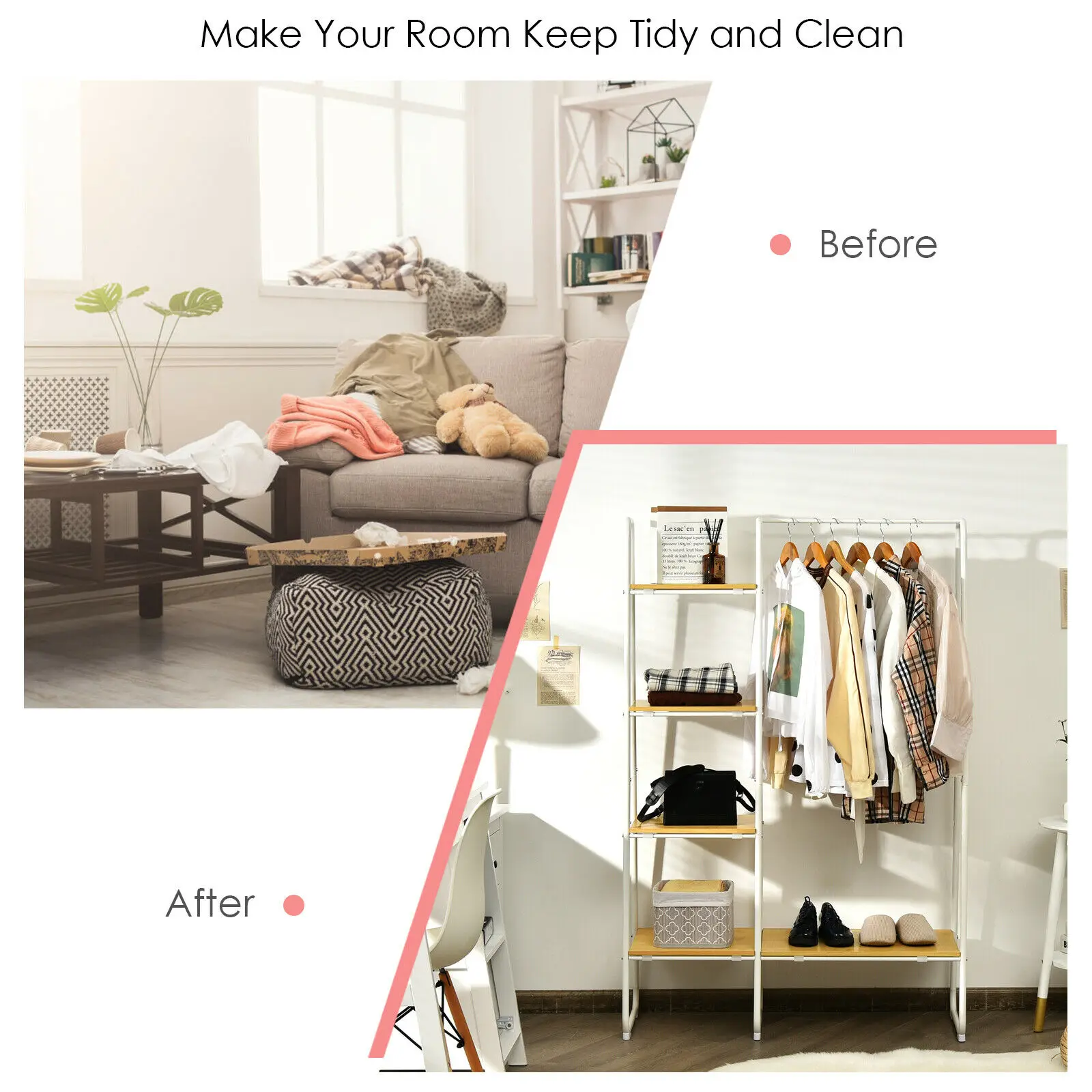 Stable frame and premium boards ensure sturdiness and durability 5 storage shelves provide spacious space for your clothes, shoes, bags Smartly organize long garments with clothes rod Anti-slip bottom foot pads protect the floor Lightweight design for easy movement Compact size of garment rack will not occupy too much space Multifunctional clothes rack to place sundries and decorations Suitable for laundry room, bedroom and living room Easy to assemble with instructions