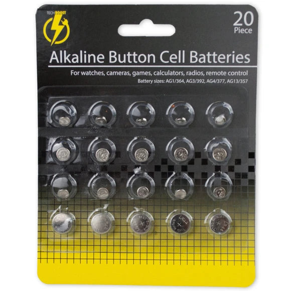 ntroducing these premium 20-piece Alkaline Button Cell Batteries, packaged in a convenient blister pack for all your power needs. Whether keeping time with your favorite watch, capturing memories with your camera, gaming to your heart's content, crunching numbers with your calculator, tuning in to your favorite radio station, or controlling devices with your remote control, these batteries are here to keep you powered up and ready to go. Crafted with reliability and longevity in mind, these alkaline button cell batteries deliver consistent and dependable performance, ensuring that your devices run smoothly and efficiently. With a 20-piece pack, you'll have more than enough batteries to keep all your gadgets and gizmos powered for the long haul. The Alkaline Button Cell battery set includes four different battery sizes: AG1/364, AG3/392, AG4/377 and AG13/357. Comes packaged in a blister pack.,Alkaline Button Cell Batteries,Baterias De Boton