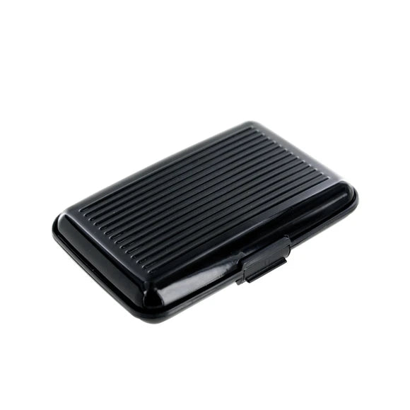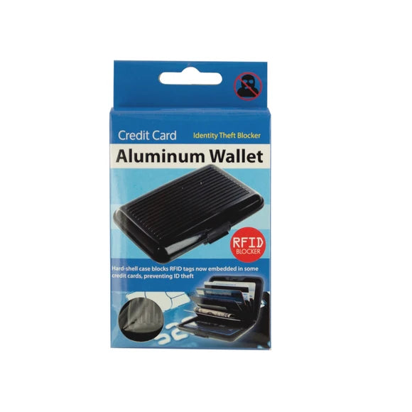 The Black Aluminum Credit Card RFID Blocker Wallet provides a secure and convenient solution for protecting credit cards from electronic theft. Measuring approximately 4.25" x 0.75" x 3", this wallet features a durable hard shell case that effectively blocks RFID signals. It includes an easy-to-open and close snap for quick access and a 6-pocket accordion interior for organized storage of credit cards, IDs, and cash. The compact and sleek design allows for easy carrying in pockets or bags, making it suitable for everyday use. The Aluminum Credit Card RFID Blocker Wallet offers a blend of security, durability, and organization in a stylish package. Comes packaged in a color hanging box. The box measures approximately 3" x 1" x 5.5". ,Aluminum Credit Card Wallet,