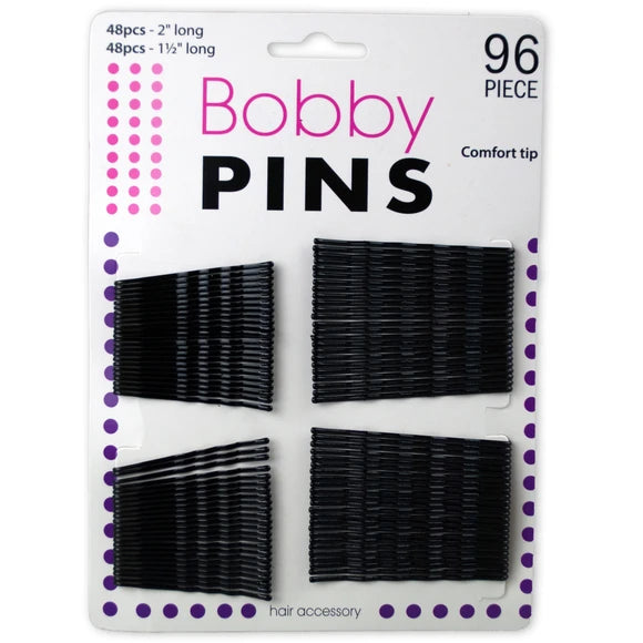Ideal for a number of hair styles, bobby pins are a beauty must-have! Each set comes with 2 assorted size bobby pins. Pins have a plastic coated tip for comfort. There are 96 bobby pins per set: 42 of each size. Large bobby pins are nearly 2" long and smaller bobby pins are 1 1/2" long. Comes packaged in a hanging panel.,Black Bobby Pins,Pasadores Negros 96Pzas