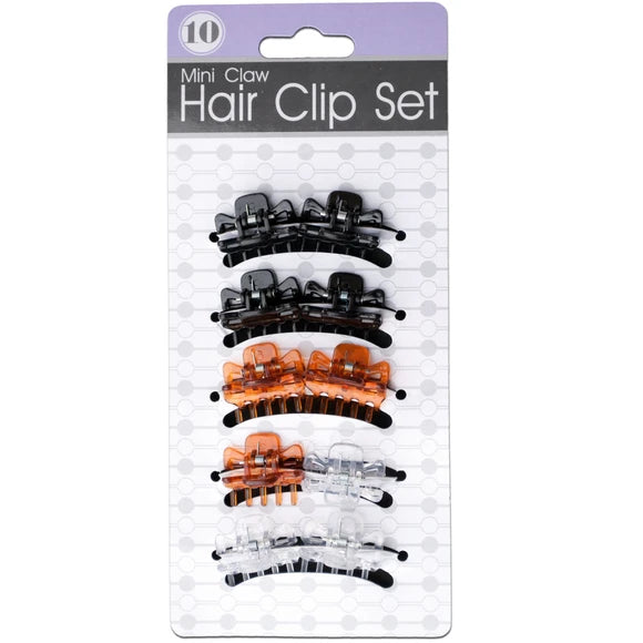 A great addition to your hair accessory collection, this 10-piece Mini Claw Hair Clip Set makes creating unique hairstyles a snap and holds hair securely in place. Clips are made of durable plastic in black, light brown and clear with metal springs. Clips measure approximately 1" x 0.875". Comes packaged to a hanging panel.,Mini Claw Hair Clip Set.