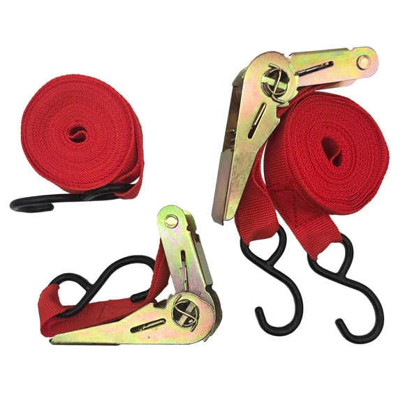 The Sterling Tools Ratchet Tie Down set is essential for securing heavy loads safely and efficiently. This 2-pack includes durable straps that measure 13 feet long, capable of handling a weight capacity of 220 pounds (100 kg) each. The high-quality ratchet mechanism allows for precise tightening and secure fastening, while the bright red straps enhance visibility. Ideal for various applications such as securing equipment in trucks and trailers or ensuring stability during transport, the Sterling Tools Ratchet Tie Down set provides the strength and reliability needed for effective cargo management. Comes packaged in a blister pack. The Package measures approximately 11.25" x .75" x 7.75".,Ratchet Tie Down Set,