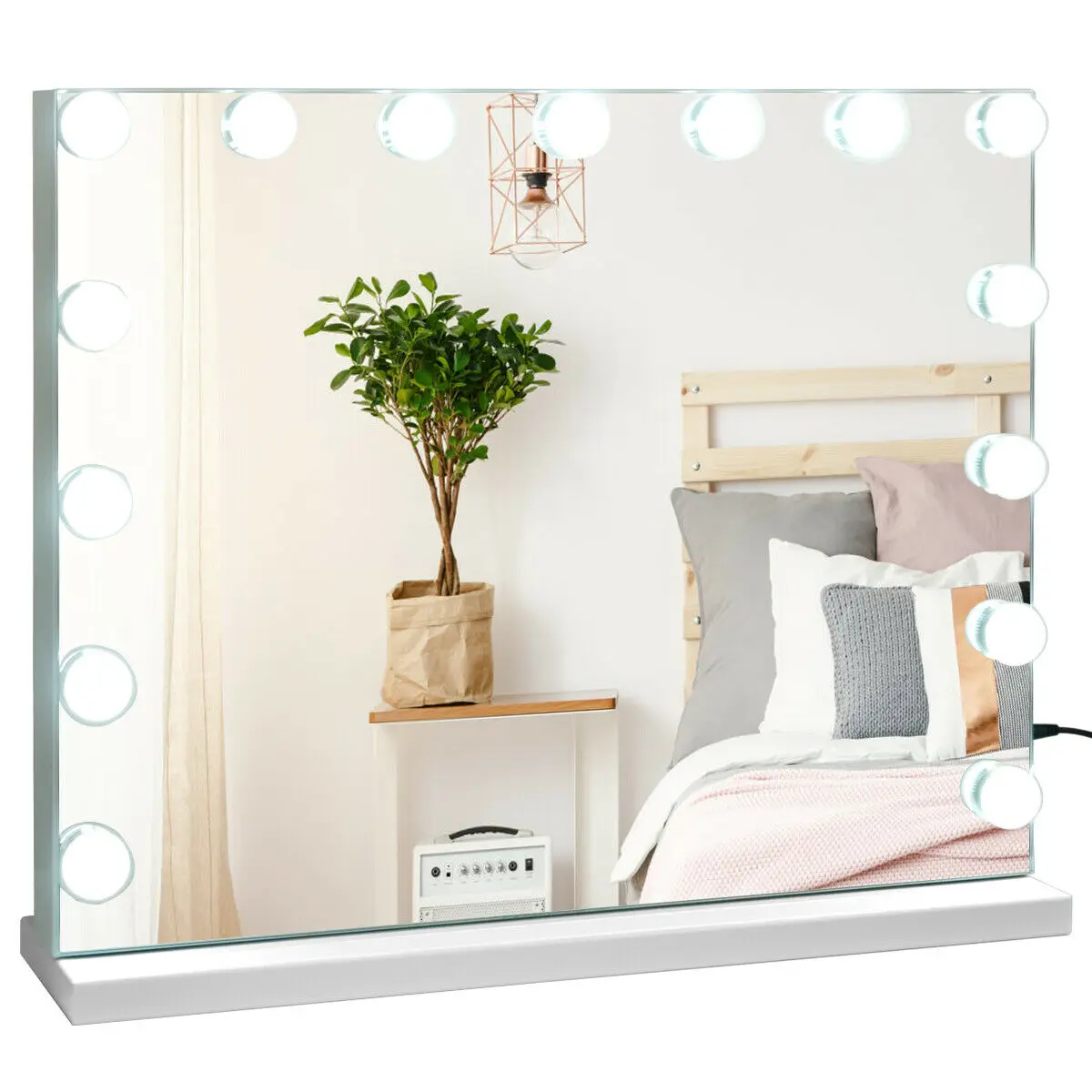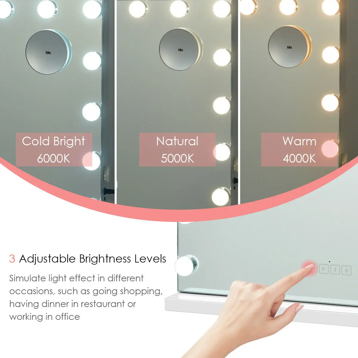 Total 15 bulbs with soft light shining like stars for all-round lightening 3 color adjustment and infinite brightness regulation for suitable makeup condition Smart touch with multi-function control for convenient mode change With Bluetooth function and its speaker for a pleasant and relaxing makeup time Detachable 10x magnifying glass offers convenience for facial care or makeup Solid metal frame with a wide base ensure long service life and better stability More considerate design, such as power outlet, USB port and headphone jack Available hanging on wall or placing on desktop to meet different needs
