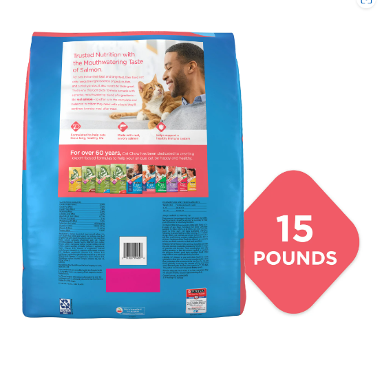 • 15 lbs bag of Cat Chow Complete High Protein Salmon Cat Food Dry Formula