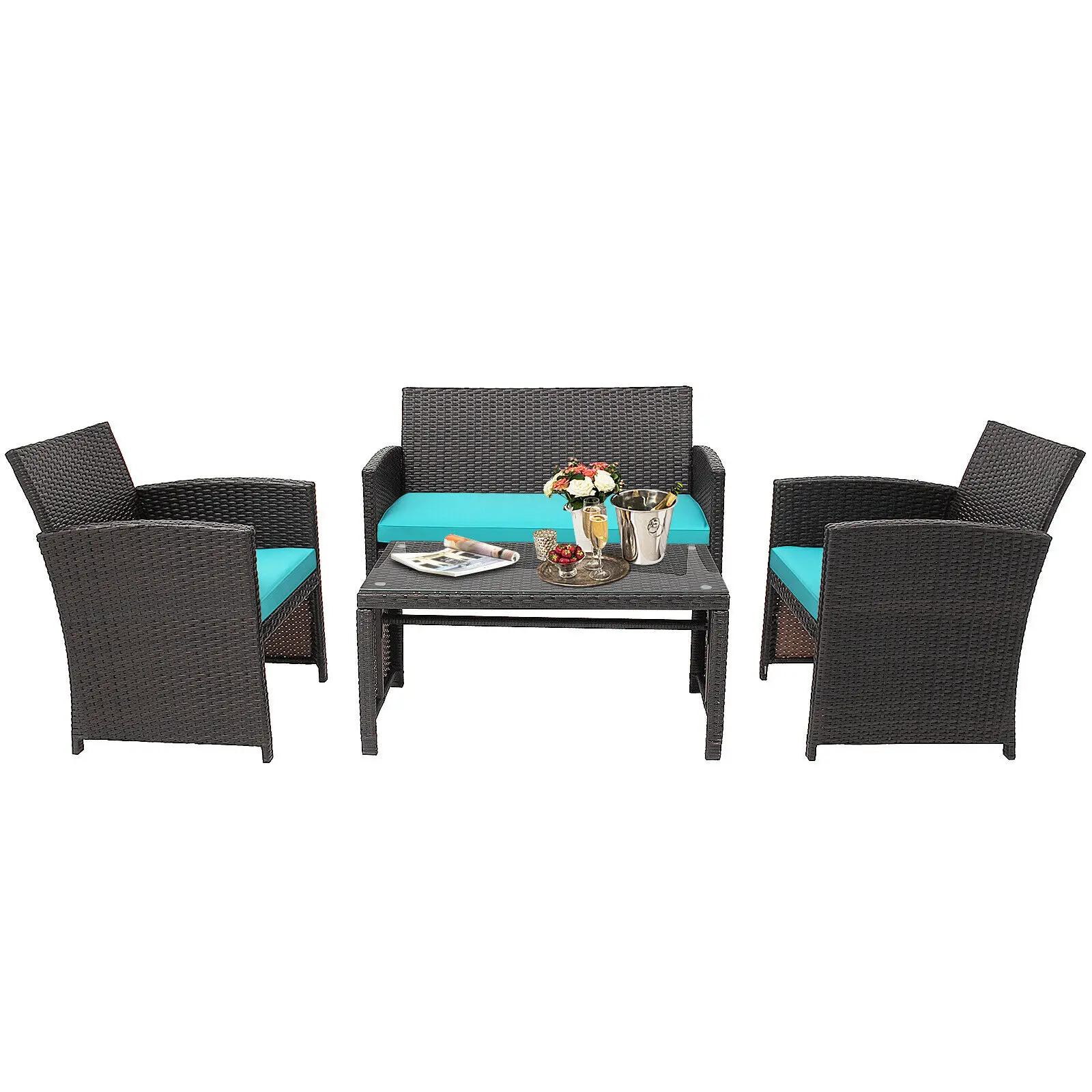 Rattan is weather resistant for longer service time Crossed frame features outstanding sturdy for better weight capacity Soft cushions increase comfort when you sit on it Humanized design with zipper of cushion cover, easy to disassemble The tempered glass coffee table provides large space for storage and display The curved backrest to fit the back perfectly for great support It can be widely used in different scenarios such as poolside, patio, etc