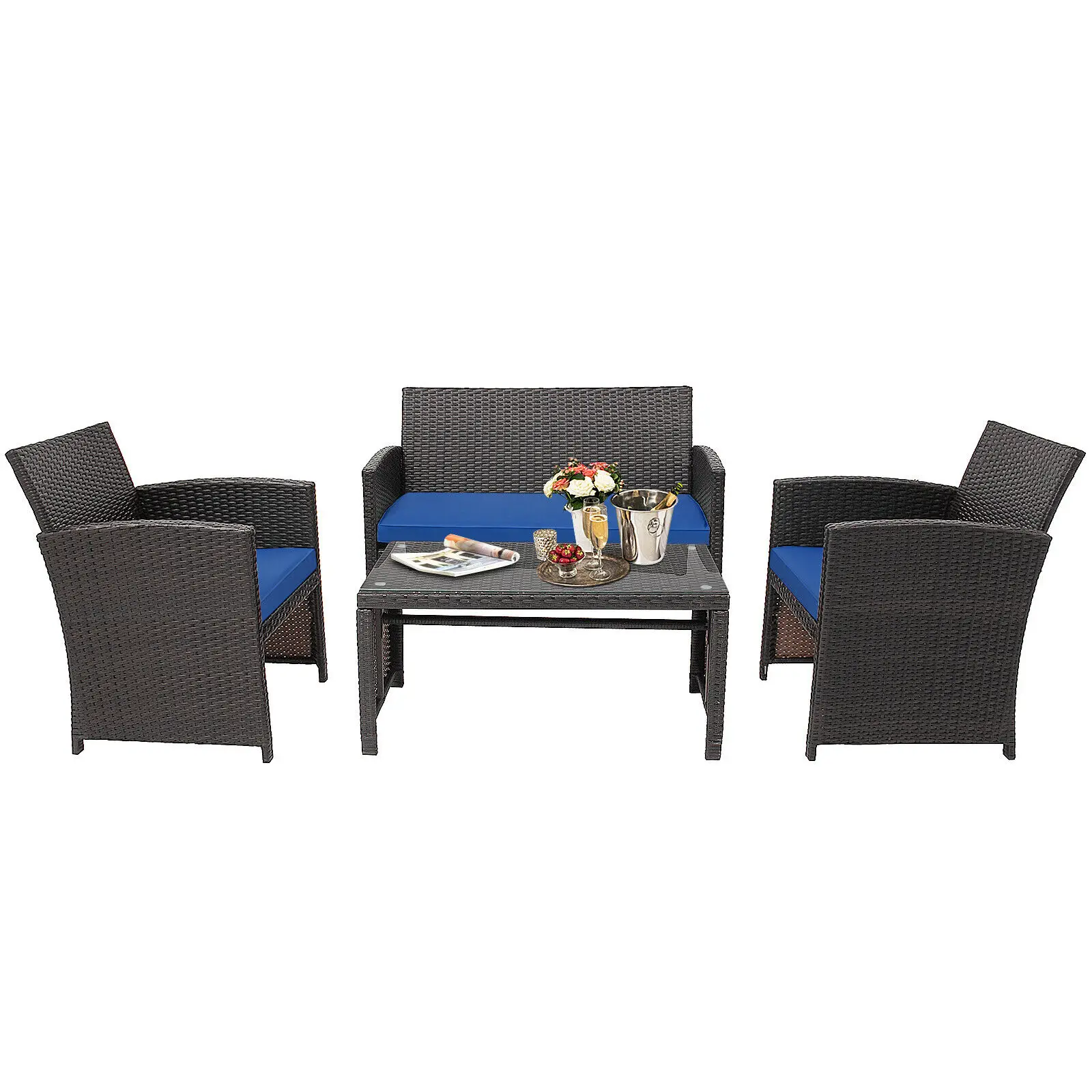 4PCS Patio Rattan Furniture Set Cushioned Chair Sofa Table HW67934
