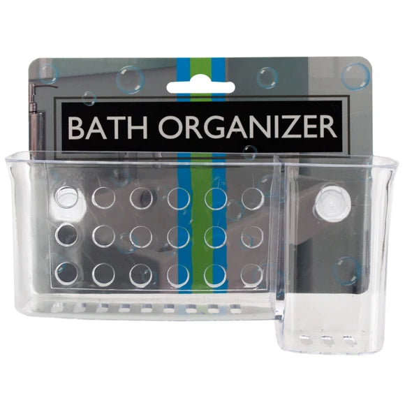 Organize bathroom essentials effortlessly with this Transparent Bath Organizer featuring strong suction cups for secure attachment. Ideal for holding toiletries, razors, and other bathroom items, this organizer keeps everything within easy reach while maintaining a clean and modern look. The transparent design complements any bathroom decor, and the durable construction ensures long-lasting use. The powerful suction cups adhere to smooth surfaces like tiles, glass, and mirrors, providing a tool-free and drill-free installation. Perfect for decluttering shower spaces, this bath organizer is a must-have for a tidy and efficient bathroom. Enhance bathroom organization with this versatile and stylish transparent bath organizer. Measures approximately 6.5" x 2.125" x 3.125". Comes packaged with a hanging panel. The Package measures approximately 6.25" x 4.75".,Bath Organizer with Suction Cups.