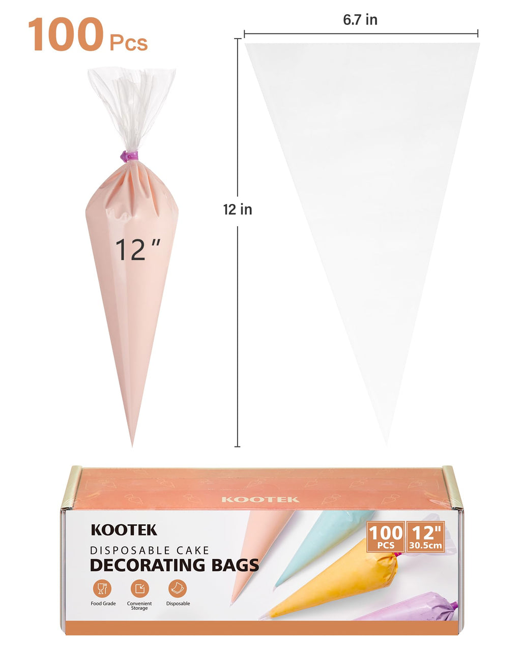 Details: Kootek's pack of 100 disposable piping bags offers you the convenience of discarding them after use, eliminating any messy clean-up and allowing you to fully enjoy your baking time. These pastry bags are neatly packed in a box, making storage a breeze. The box design also allows for one bag to be effortlessly pulled out at a time, which is especially helpful when your hands are occupied with frosting.
