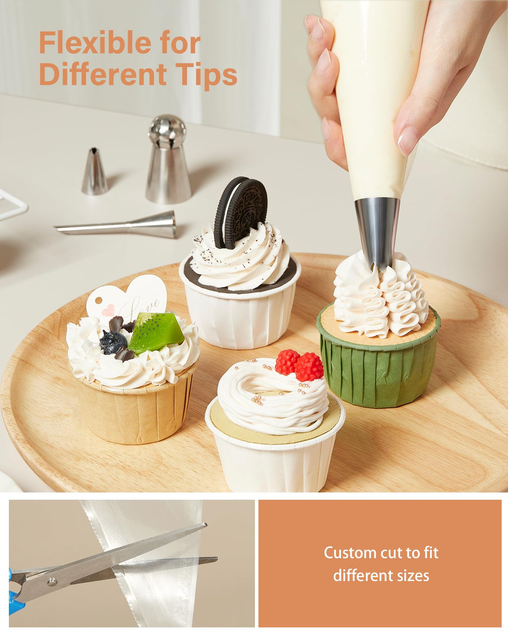 - Use with or without Piping Tips: Adjust the end of the pastry bag based on the size of your tips or couplers. Our frosting bags are compatible with various piping tip sizes, or they can be used directly for creating patterns on cakes without the need for tips. They are ideal for beginners, bakers, or cake decorating enthusiasts.