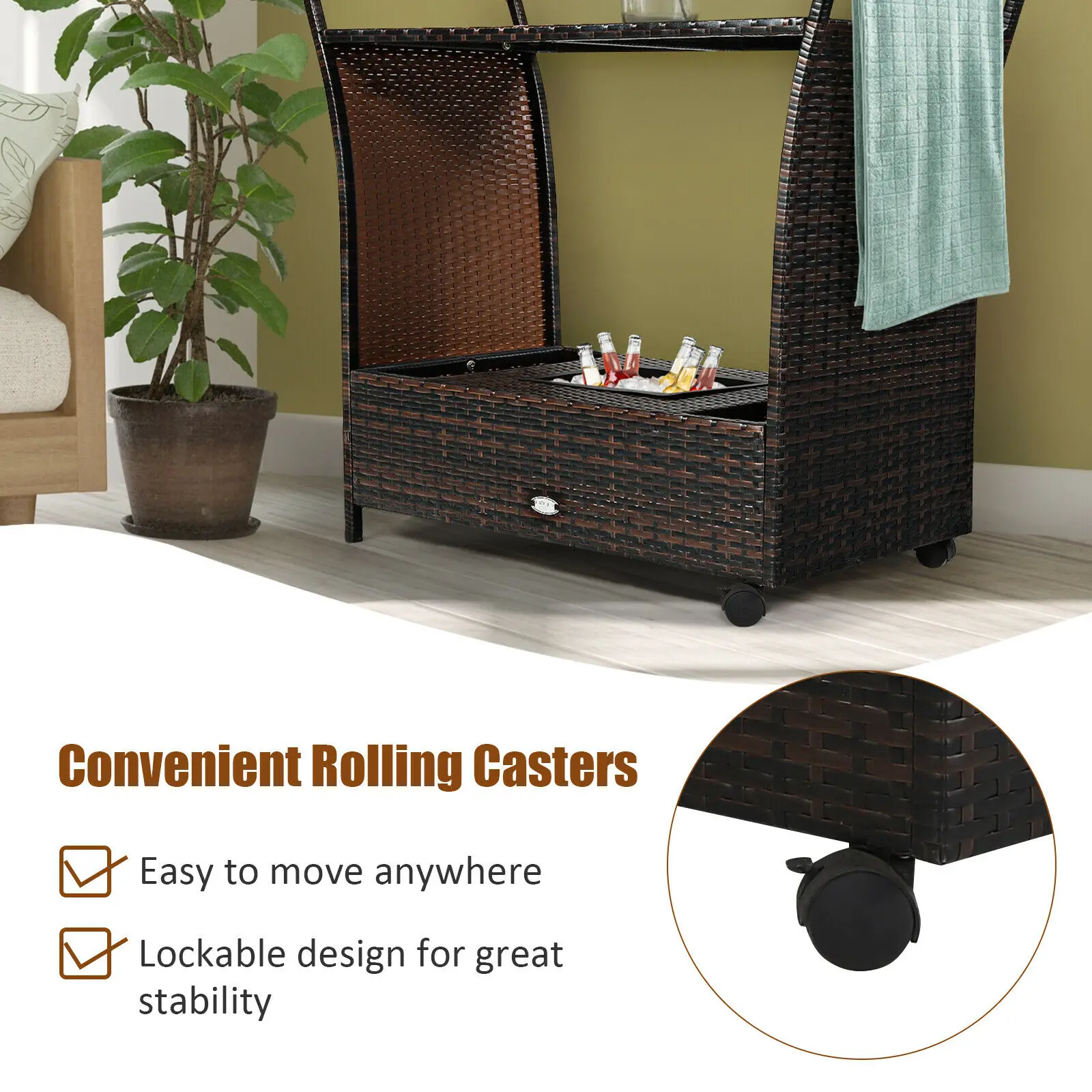 This patio wicker bar cart is perfect for entertaining friends or holding family parties in your backyard, garden, poolside or other living space. Featuring a spacious tempered glass table and a removable ice bucket for storing drinks, this bar cart can provide a relaxing and elegant place for you to hold a party or have meals with your family members or friends. Made from powder coated steel frame and all-weather rattan, this dining cart is stable and durable enough to support long lasting use. Besides, the smooth glass table top is easy to clean with damp cloth. And equipped with 2 lockable wheels and humanized handles, this wicker bar cart is easy to move and carry. Moreover, with the exquisite rattan style and multifunction design, this wine serving cart is a perfect addition to your home.
