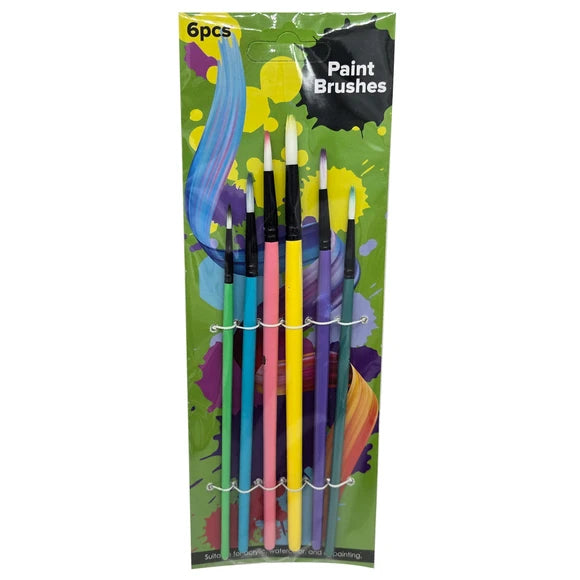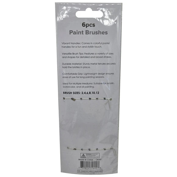 The 6 Piece Round Fine Tip Head Art Paint Brush Set is designed for versatile use with various mediums, including watercolors, acrylics, and oil paints. Each brush features color-coordinated bristles and handles for easy identification during art projects. These brushes are highly absorbent, soft, and multi-functional, ensuring smooth application and blending. The set includes six different sizes: 2, 4, 6, 8, 10, and 12, each with bristle lengths of 0.50 inches. This set is ideal for intricate detailing, fine lines, and delicate work, making it perfect for tasks such as precision painting, calligraphy, and detailed illustrations. Whether for adding fine accents or creating intricate designs, these brushes are essential for artists seeking to achieve meticulous results. The set comes packaged on a hanging tie card and polybag. The Package measures approximately 4" x 10.25".,6 Piece Round Fine Tip Head Art Paint Brush Set.