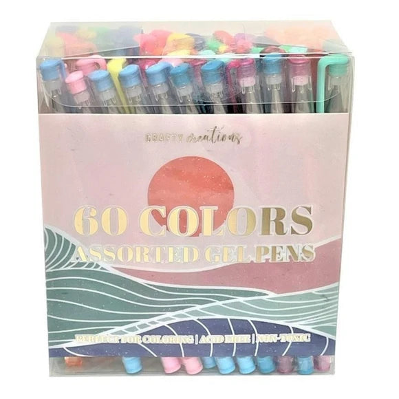 Add a soft and dreamy touch to your artwork with the 60-Pack Pastel and Light Colorful Gel Pens by Crafty Creations! Featuring a beautiful selection of pastel, neon, metallic, glitter, and classic shades, this set is perfect for coloring, journaling, scrapbooking, and creative projects. The acid-free, non-toxic ink ensures smooth, vibrant, and long-lasting results, while the ergonomic clear-barrel design provides a comfortable grip for extended use. Packaged in an elegant, ocean-inspired storage box with gold foil lettering, this set is both stylish and functional, making it an ideal gift for artists, students, and stationery lovers alike!,60 Pack Pastel and Light Colorful Gel Pens.