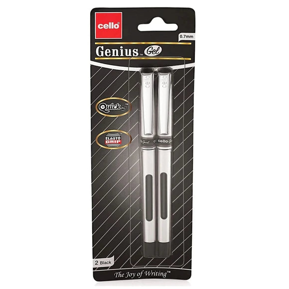 Experience effortless writing with the Cello Genius Gel Pens 2-Pack, designed for performance and comfort. These sleek black ink pens feature a 0.7mm tip for smooth, precise lines and a Quick Dry formula that prevents smudging perfect for both left- and right-handed writers. Each pen includes an Elasto Grip for enhanced control and comfort during long writing sessions. The pens come packaged in a bold black-and-gold blister card with modern diagonal stripe design and a clear plastic window showcasing the premium silver-barreled pens. Ideal for school, office, or home, this value pack delivers The Joy of Writing in every stroke.,Cello 2 Pack 0.7mm Quick Dry Genius Gel Black Pens.