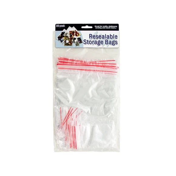 Resealable Bags help in organizing items and ensuring easy identification. Crafted from durable, transparent material, these bags allow quick content checks without opening each one, saving time and frustration. Whether storing beads, buttons, ribbons, stickers, or other small crafting essentials, these bags offer a practical and efficient storage solution. Each package includes 36 bags in 3 sizes: large (5" x 7"), medium (2 3/4" x 4 3/4"), and small (2" x 3 1/4"). It comes packaged in a poly bag with a header card. The Poly bag measures 5.75" x 11".,Resealable Storage Bags,Blosa Plastica Para Almacenar