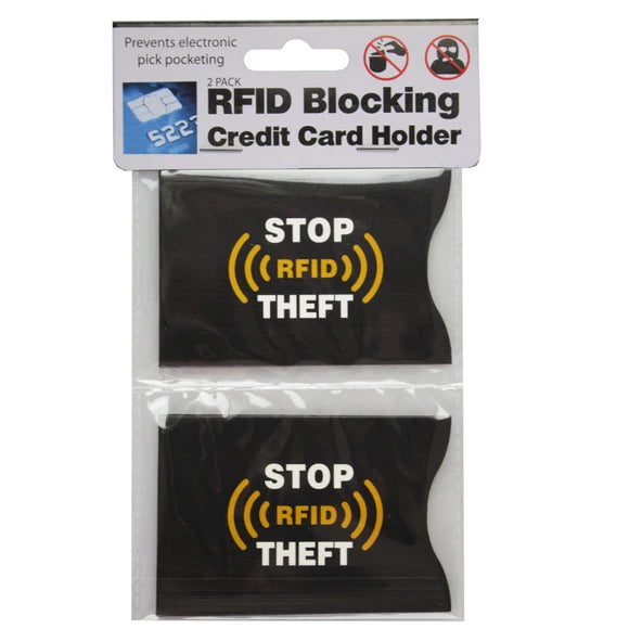 Help yourself and your precious money stay protected from electronic pickpocketing with these two essential Credit Card Holders. The holders are designed to help prevent RFID pickpocketing, which is essentially using the "tap" feature on your card to pickpocket. Two come in each hanging polybag with a header card, making them perfect for storing both your debit and credit card in. The holders are black and read "STOP RFID THEFT" across the front. They measure the size of a credit card with an insert on the side.,RFD Credit Card Holder.