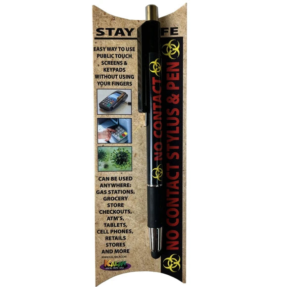 The Stay Safe Non-Contact Stylus Pen is the perfect way to keep your fingers and hands from touching public screens and keypads. It helps stop the spread of germs and bacteria by tapping the surface for you. The rubber-tip stylus is perfect for keypad screens at the grocery checkout, gas station pumps, ATMs, and more. The no-contact pen has a clip, so it attaches to your bag or can be attached to your planner. Comes packaged on a hanging card. ,Stay Safe Non Contact Stylus Pen.