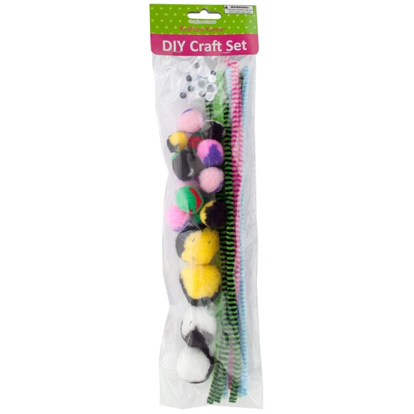 Perfect for children and adults alike, this kit provides endless possibilities for imaginative crafting fun. Great for arts and crafts projects at home, school, or parties, our craft kit is sure to spark joy and inspire endless hours of creative exploration. From simple shapes to intricate designs, the possibilities are endless with this versatile and colorful kit. Whether making adorable animals, funky creatures, or colorful decorations, the only limit is your imagination. Set includes striped craft pipe cleaners, assorted two-tone poms and assorted wiggly eyes. For ages 3 and up. The kit comes packaged in a poly bag with a header card. The package measures approximately 4" x 14".,Striped DIY Craft Making Set.