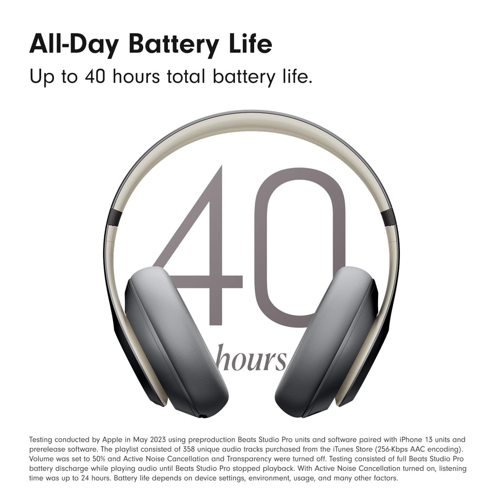 3 Testing conducted by Apple in May 2023 using preproduction Beats Studio Pro units and software paired with iPhone 13 units and prerelease software. The playlist consisted of 358 unique audio tracks purchased from the iTunes Store (256-Kbps AAC encoding). Volume was set to 50% and Active Noise Cancellation and Transparency were turned off. Testing consisted of full Beats Studio Pro battery discharge while playing audio until Beats Studio Pro stopped playback. With Active Noise Cancellation turned on, listening time was up to 24 hours. Battery life depends on device settings, environment, usage, and many other factors.