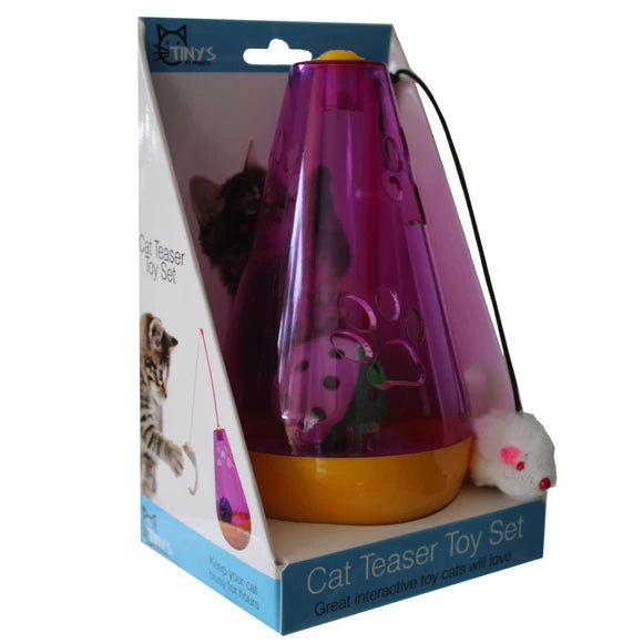 If you work long hours, have school, or are out and about leaving your cat home alone for extended periods of time, stop worrying about if they're bored and get them this interactive Cat Teaser Set! The toy is shaped like a teardrop and is weighed down to stay standing while your cat plays with the white mouse toy that attaches to the top of it. The purple toy is decorated with small paw windows to allow the sound of the rolling bell ball inside of the toy to intrigue your cat. The toy has a yellow base and top piece. It comes packaged in a hanging display with the attachable mouse toy. ,Cat Teaser Set.