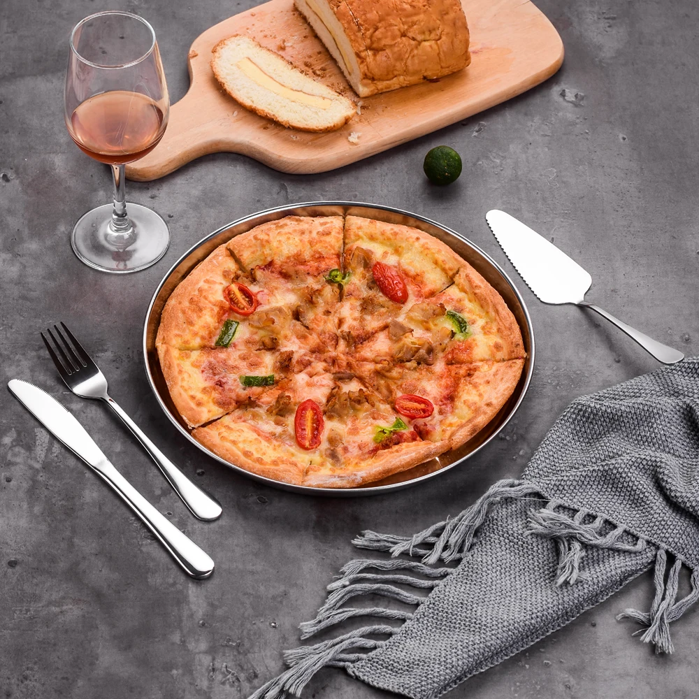 QUALITY STEEL CONSTRUCTION - pizza pans are made of high quality pure stainless steel without any chemical coating. They do not let off metal or any other taste or substance into your dough. No more aluminum into your food, great replacement of aluminum pans. Rust and warping resistant, durable for daily use. These pizza pans have superb mirror finish to reduce the risk of food sticking. Gently sloped edge gives you a comfortable holding that you can safely pull it in and out of the oven.