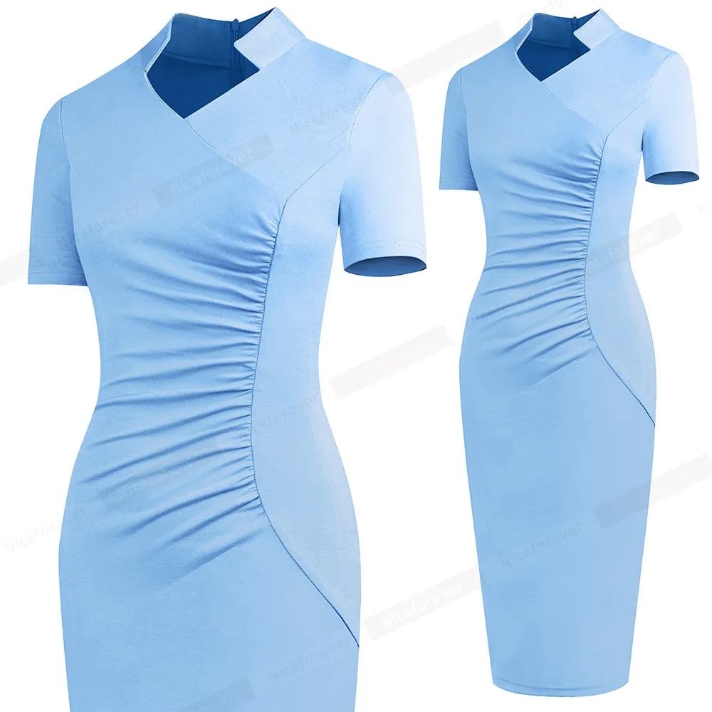 Nice-forever Vintage Elegant Solid with V neckline vestidos Business Party Bodycon Slim Women Work Dress B579