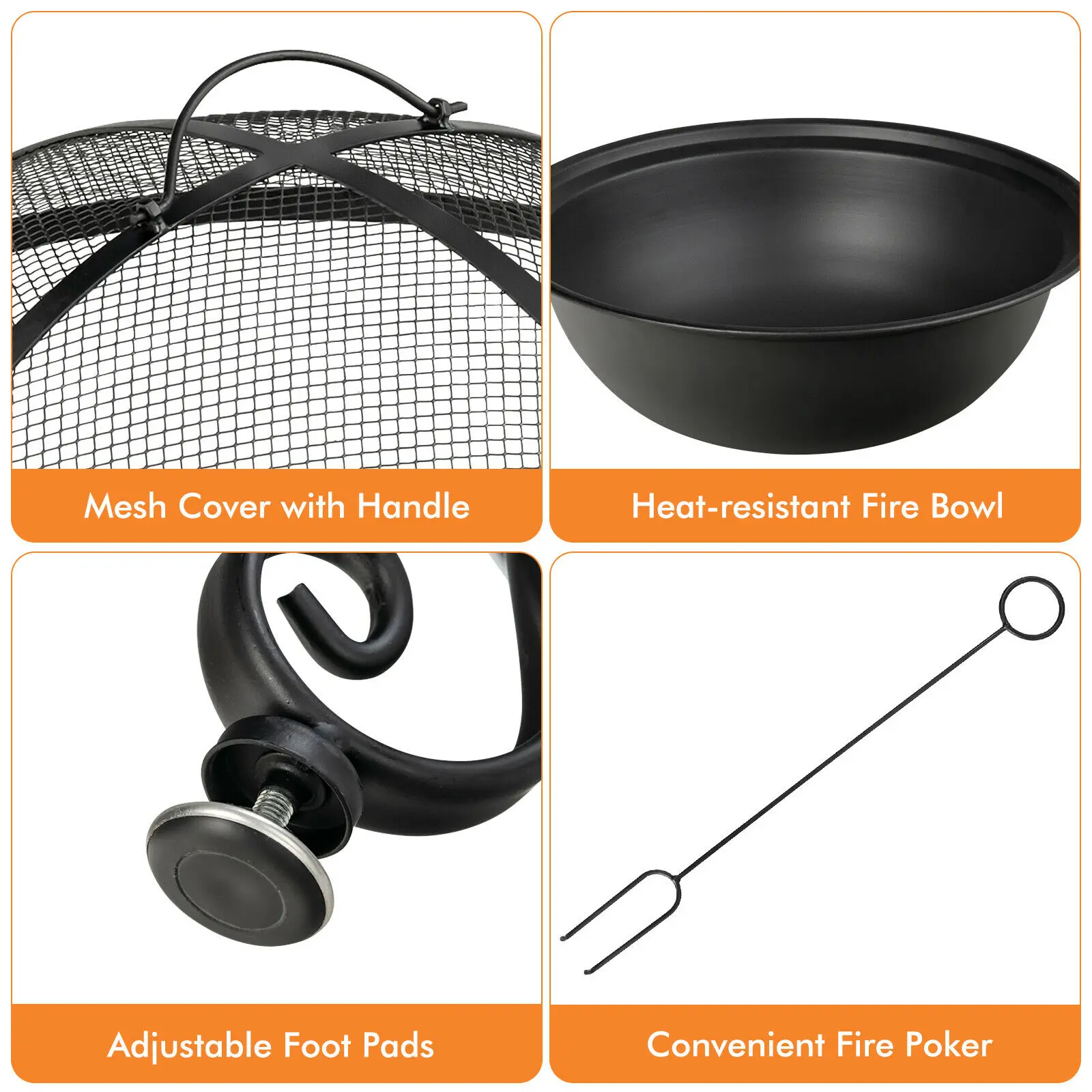 Add warmth to your patio, deck or backyard with this versatile wood burning fire pit table! This round fire pit is ideal for cool nights out on your patio with family or friends, which also can serve as a practical dining table for your indoor activity. Made of heavy duty steel frame with heat-resistant finish, our fire pit table features excellent sturdiness and durability. Thanks to its waterproof and rustproof design, you can use it for long-lasting outdoor use in confidence. Plus, the deep fire bowl makes this fire pit ideal for burning bonfires and even roasting marshmallows. And the adjustable foot pads maintain overall stability. Comes with an easy to lift mesh spark cover and a poker, this 4 in 1 fire pit table allows you to use it easier and safer.