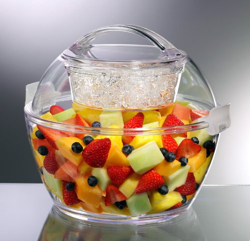 Details: Carry & serve bowl with ice chamber above. Cold air descends keeping salads and such chilled and fresh for hours on the go or on the table. Large Capacity 5. 5 quart bowl. Clip-on dome lid with built-in ice chamber and carry handle. Screw-on lid for ice chamber with leak proof silicone seal. For “to go” mode, simply flip the clips up to lock Dome lid to bowl. No need to clip during “to serve” mode. Dome lid keeps the cold in and the bugs out. Ice may be replaced at any time without disturbing the salad. Bowl overall measures 10 ¾” D x 10” H.