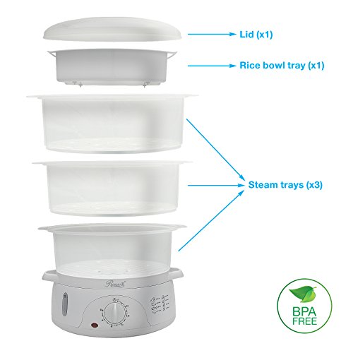 • Food steamer with 3-tier stackable BPA-free transparent baskets, BPA free rice bowl, total 9.5 quarts (9L), makes cooking safe